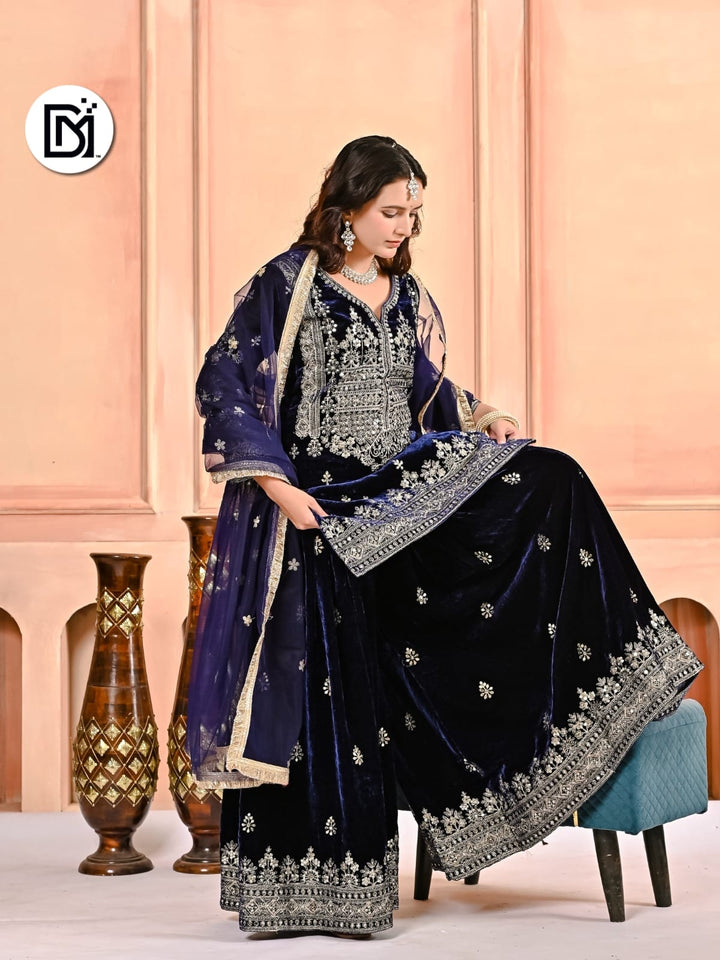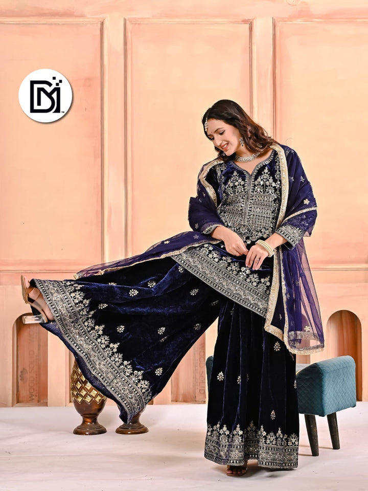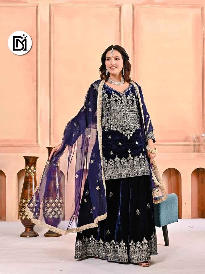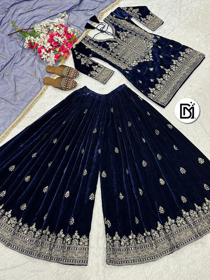 Designer Party Wear Navy Blue Top, Sharara Palazzo & Dupatta Set for Women | Heavy Velvet Embroidered Sharara | Butterfly Net Dupatta | Fully Stitched Festive & Wedding Outfit