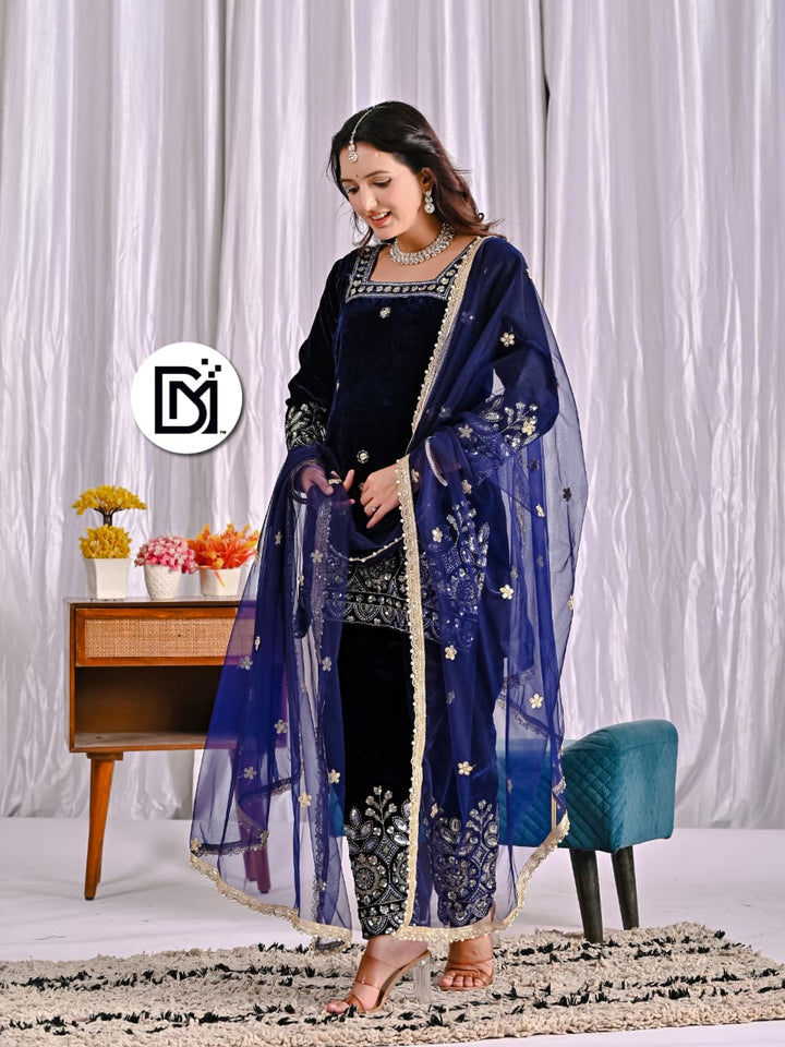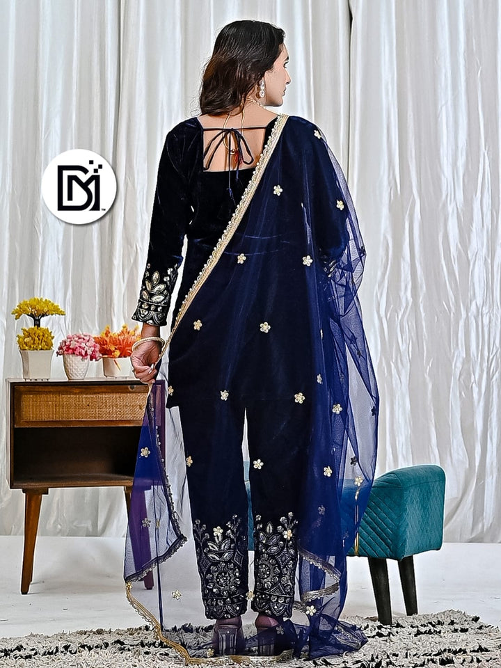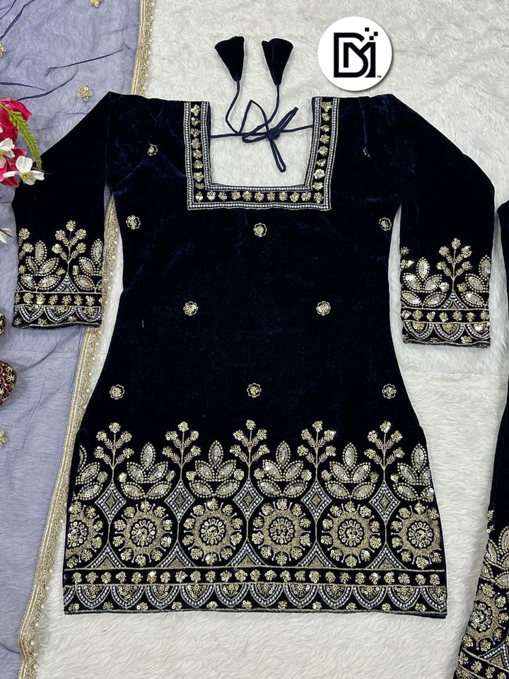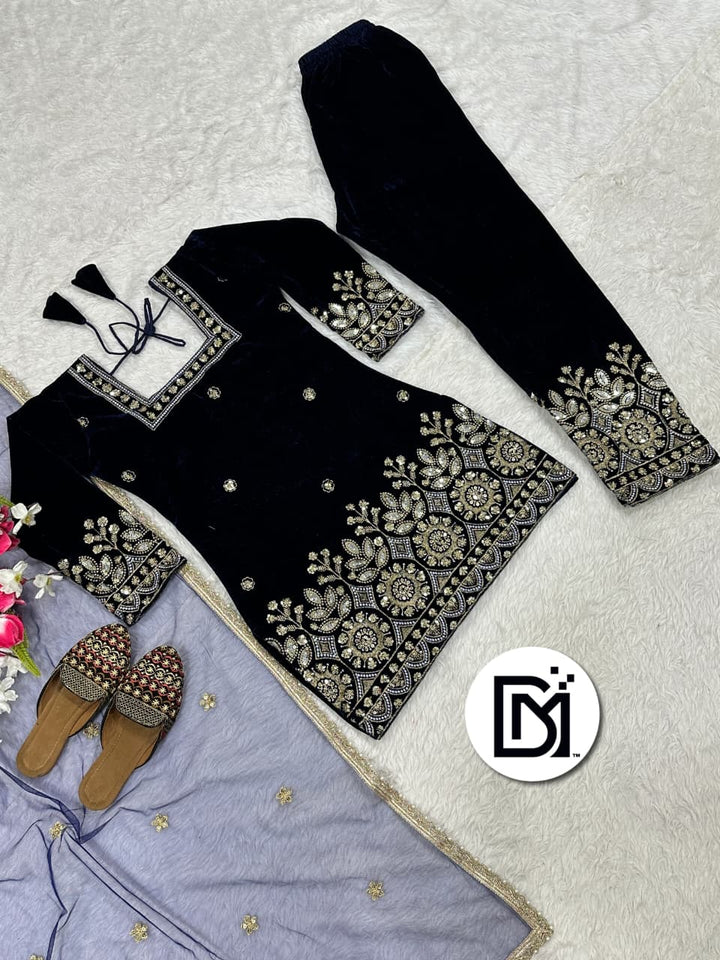 Designer Party Wear Women’s Velvet Embroidered Suit Set – Navy Blue | Heavy Viscose Velvet Top & Pant (Fully Stitched) with Butterfly Net Embroidered Dupatta | Premium Festive/Ethnic Outfit