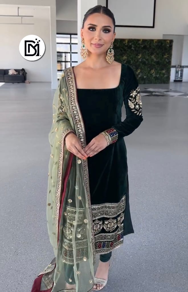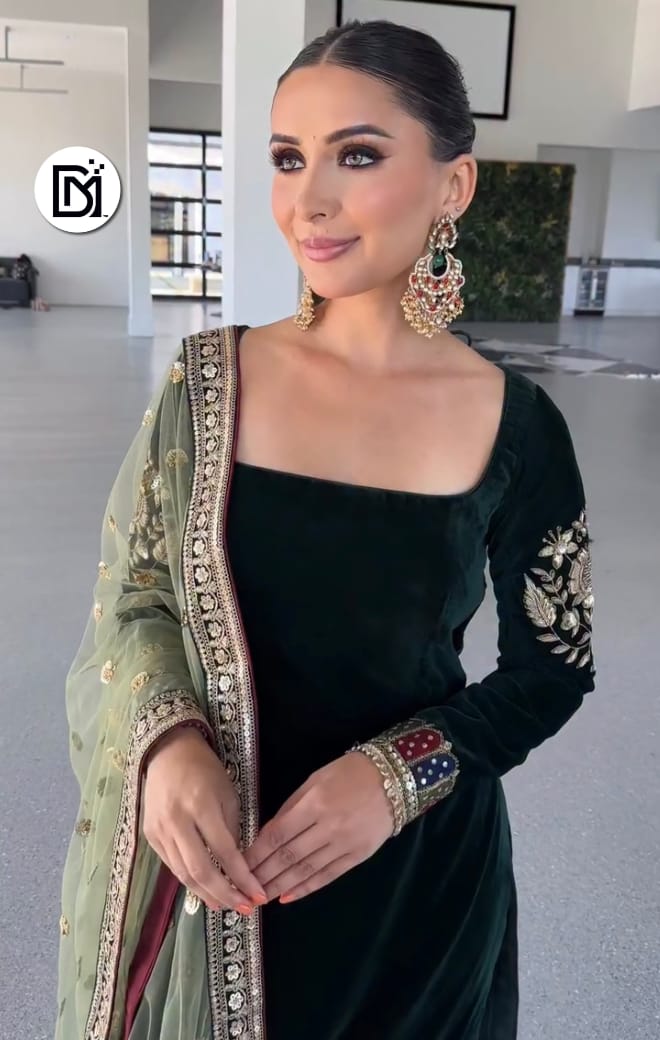 Introducing the latest Designer Party Wear Deep Dark Green Velvet Outfit Set, crafted to give you a rich and luxurious festive look. The outfit features a beautifully designed Pure Heavy Viscose Velvet Top adorned with detailed coding embroidery and premium sequence work. The top comes with fully embroidered sleeves and a soft micro cotton inner lining for complete comfort and graceful drape.