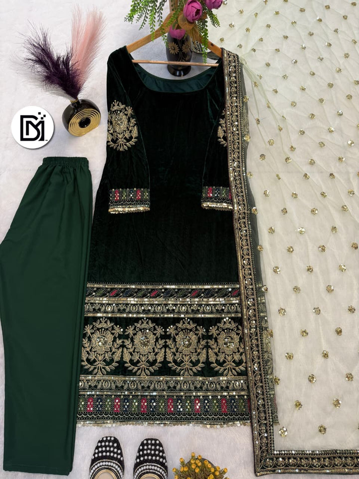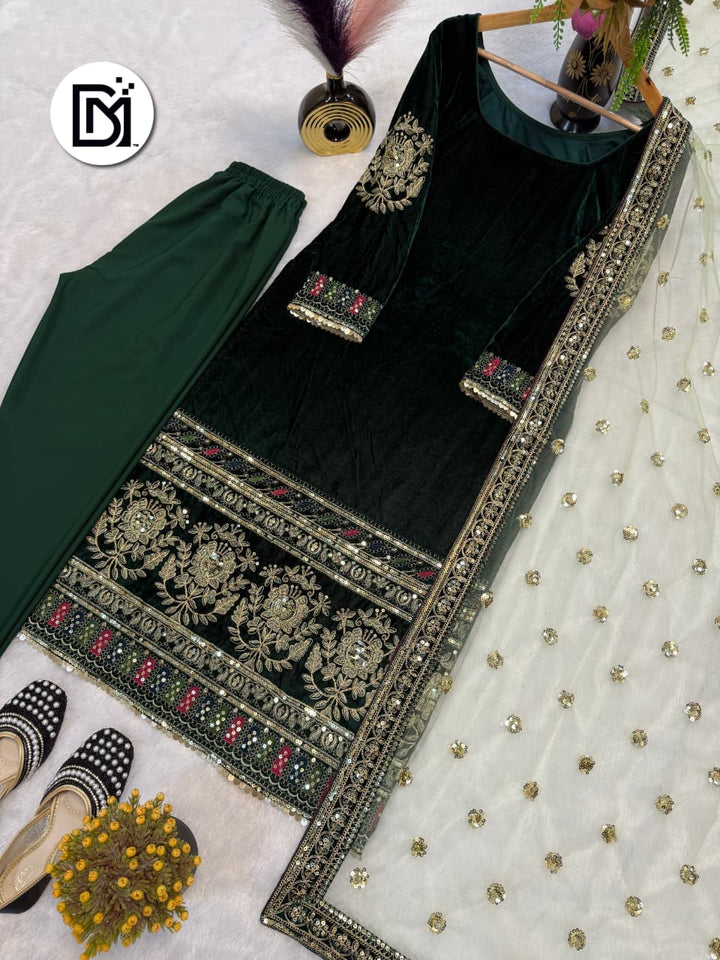 New Party Wear Deep Dark Green Viscose Velvet Designer Top-Dupatta Set with Fully Stitched Micro Crepe Silk Bottom | Heavy Embroidery & Sequins Work | Women’s Festive Outfit